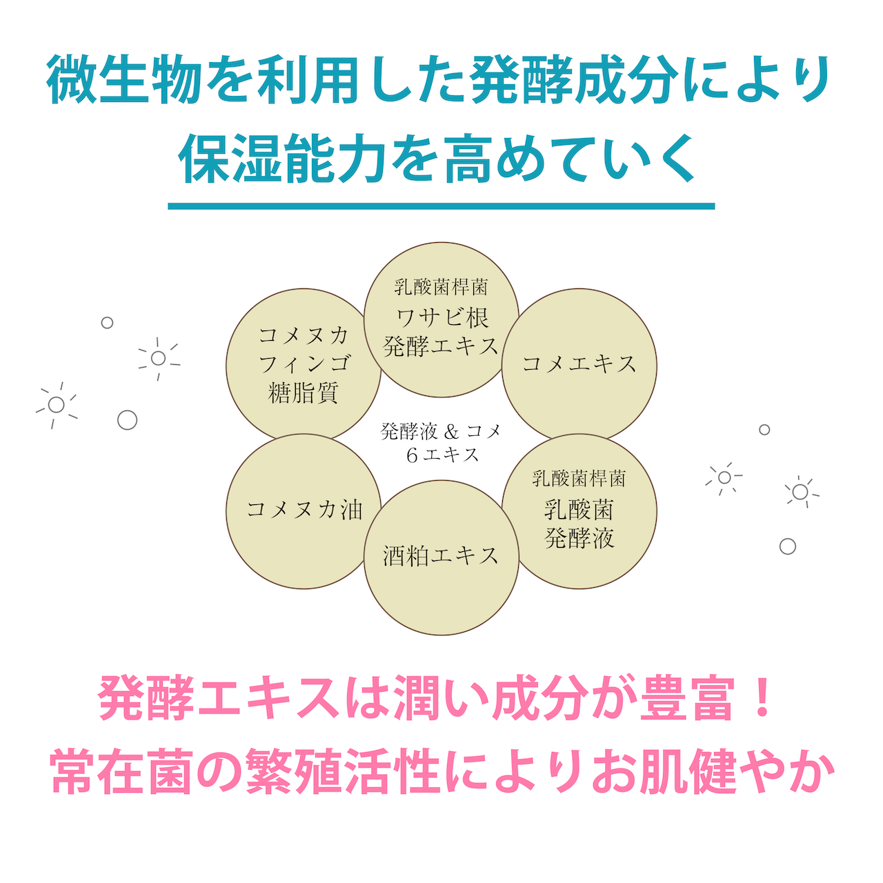 水、BG、グリセリン、コメエキス、乳酸桿菌/ワサビ根発酵エキス、乳酸桿菌発酵液、コメヌカスフィンゴ糖脂質、コメヌカ油、酒粕エキス、プラセンタエキス、加水分解コラーゲン、サクシノイルアテロコラーゲン、アラントイン、加水分解ローヤルゼリータンパク、レシチン、尿素、グリチルリチン酸2K、ユズ果実エキス、ビワ葉エキス、アロエベラ葉エキス、ウメ果実エキス、スイゼンジノリ果糖体、アシタバ葉/茎エキス、メリッサ葉エキス、セイヨウノコギリソウ花エキス、スギナエキス、スイカズラ花エキス、メボウキ花/葉エキス、ボタンエキス、フユボダイジュ花エキス、フキタンポポエキス、タチジャコウソウ花/葉/茎エキス、ダイウイキョウ果実エキス、セージ葉エキス、セロリエキス、カミツレ花エキス、オノニスエキス、ウスニアバルバダエキス、アルニカ花エキス、アルテア根エキス、オレイン酸ポリグリセリル-10、ペンチレングリコール、ポリソルベート-20
